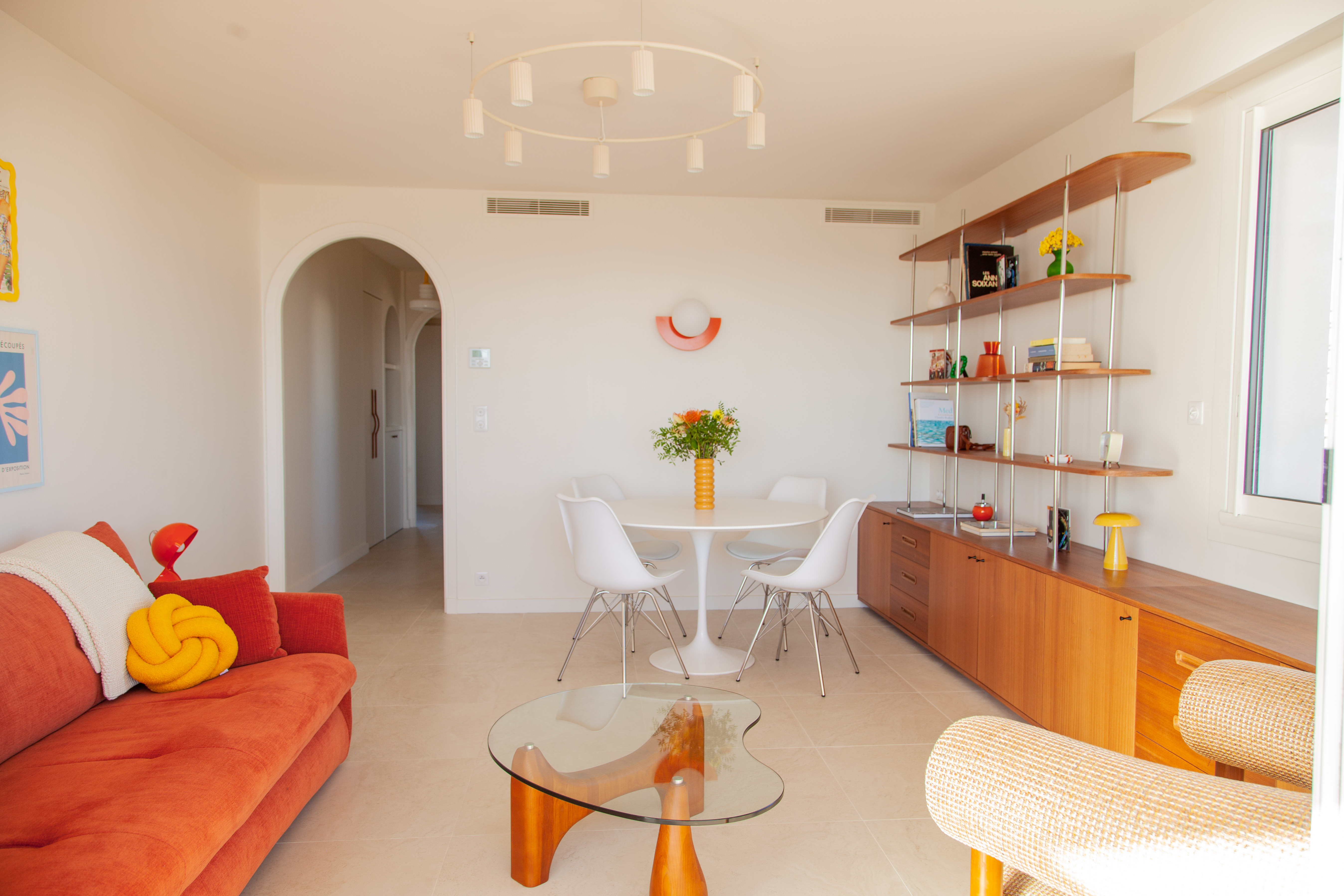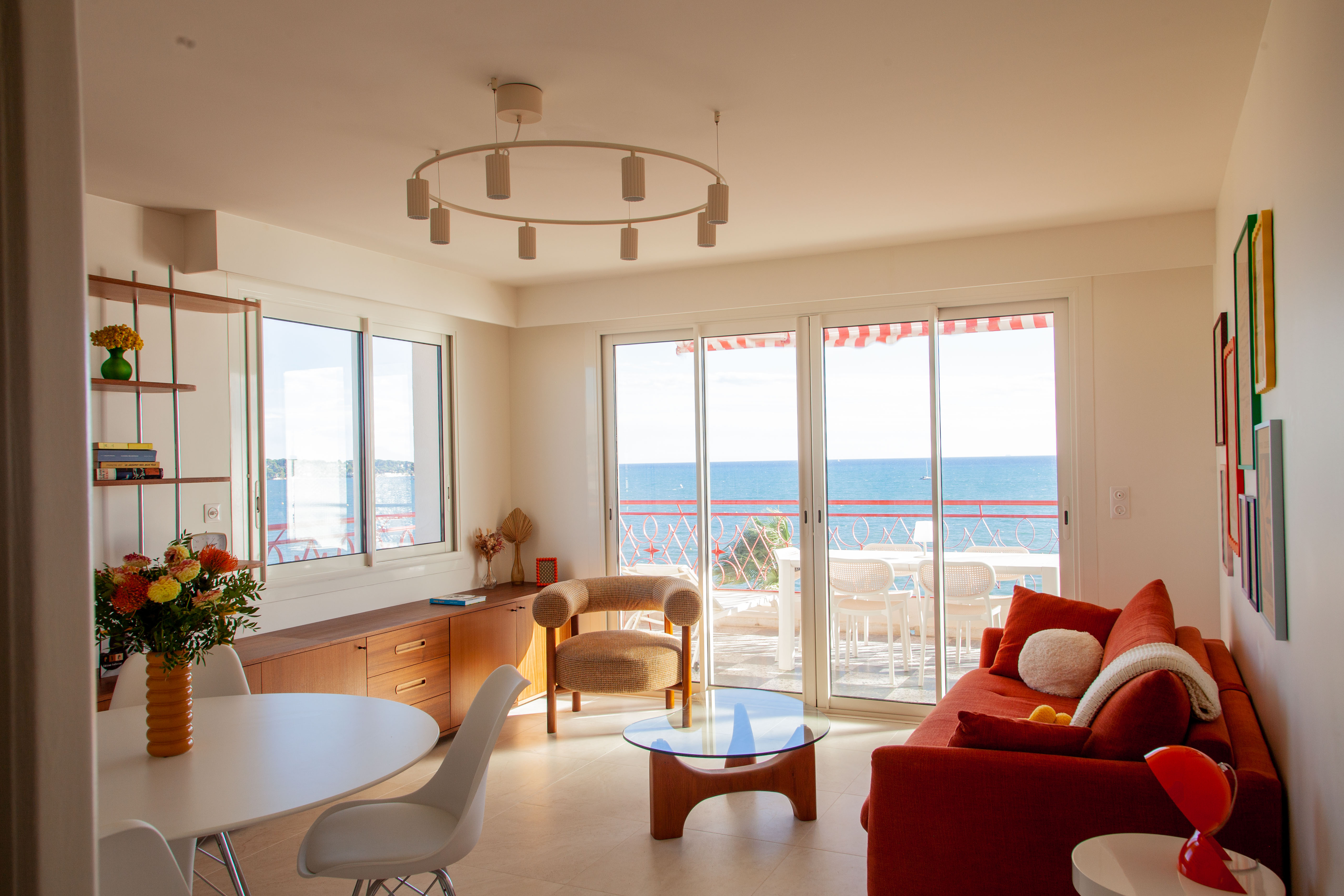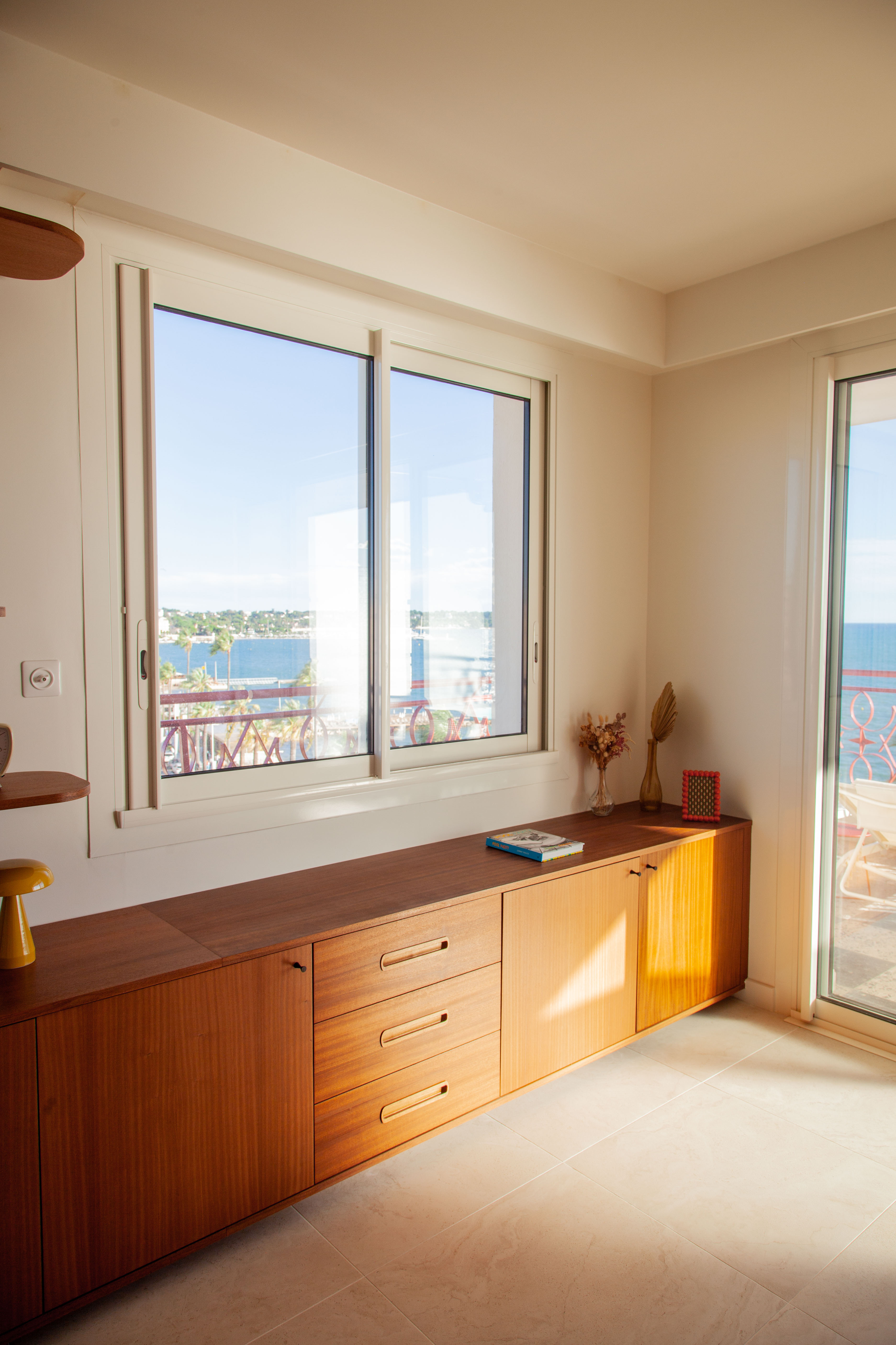 Rénovation d'un magnifique 3 pièces dans le Sud de la France, qui était resté jusqu'à présent totalement dans son jus des années 70, et qui possède une vue sur la mer Méditerranée époustouflante. La transformation a été totale, avec notamment un remplacement de tous les sols, portes et fenêtres de l'appartement, la création d'un WC séparé de la salle de bains, et la conception de nombreux meubles sur-mesure.